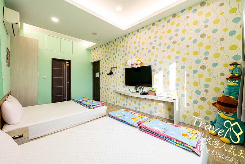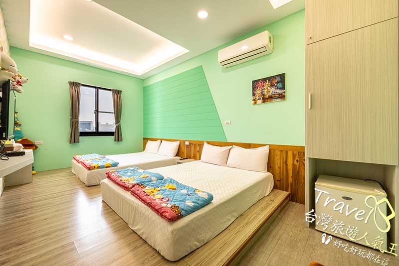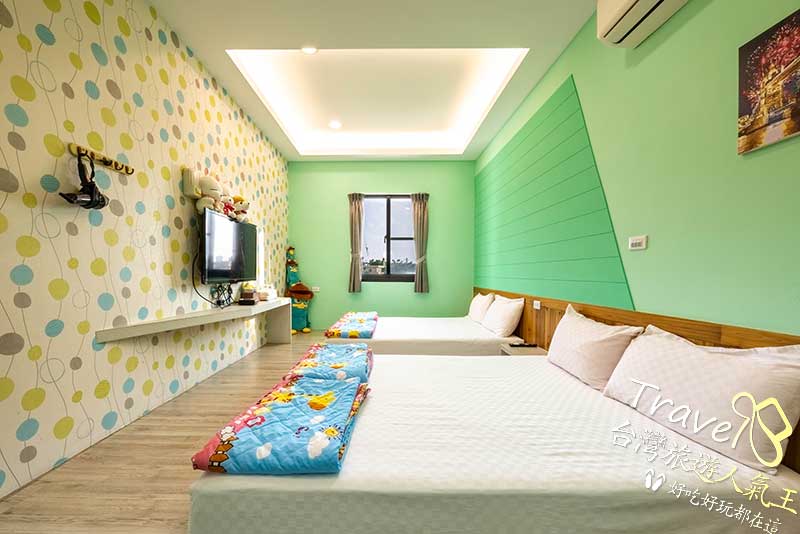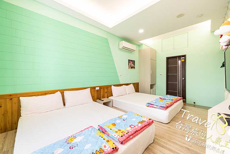 曼琉球民宿的四人房以 明亮自然光線、溫馨木質設計 為主調,